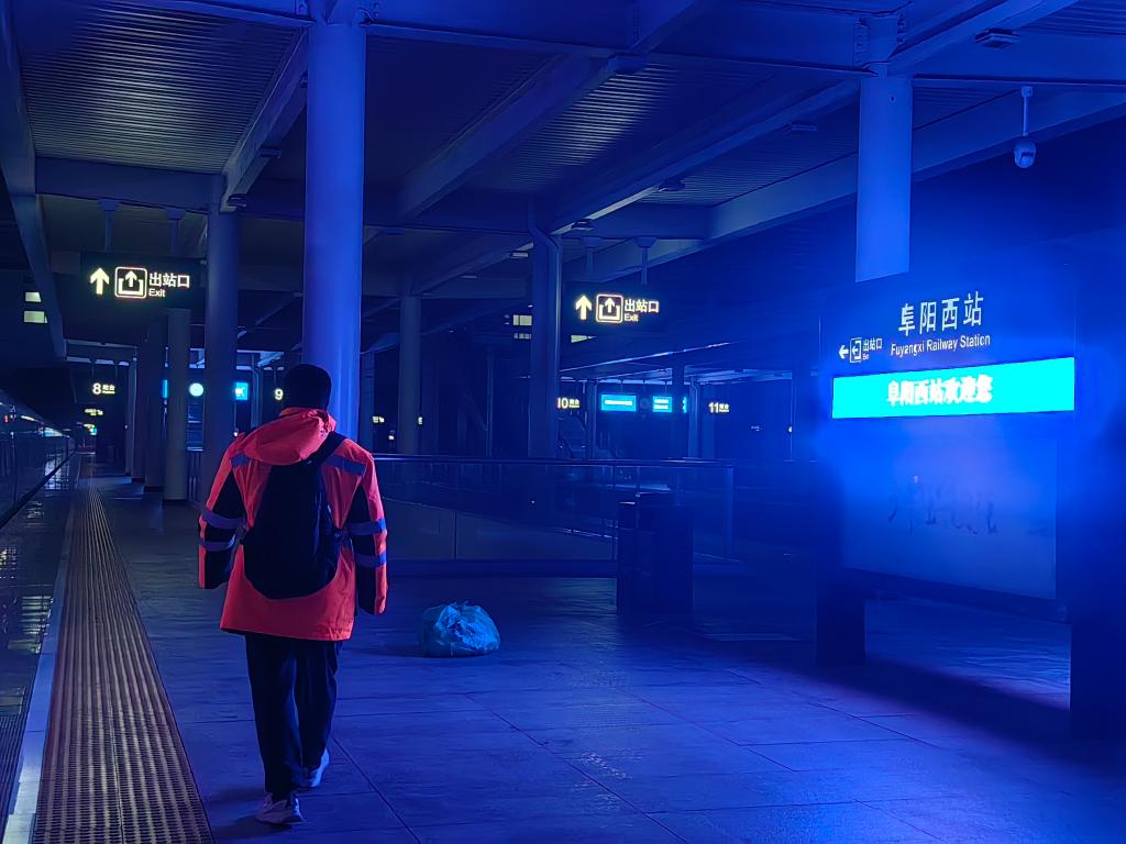 凌晨4时05分,气温仍在零下。冷风呼啸的合肥站1站台上,身穿醒目的橙色工作服、背着黑色双肩包的李强准时出现在记者眼前:“准备好了吗?上车吧!”
