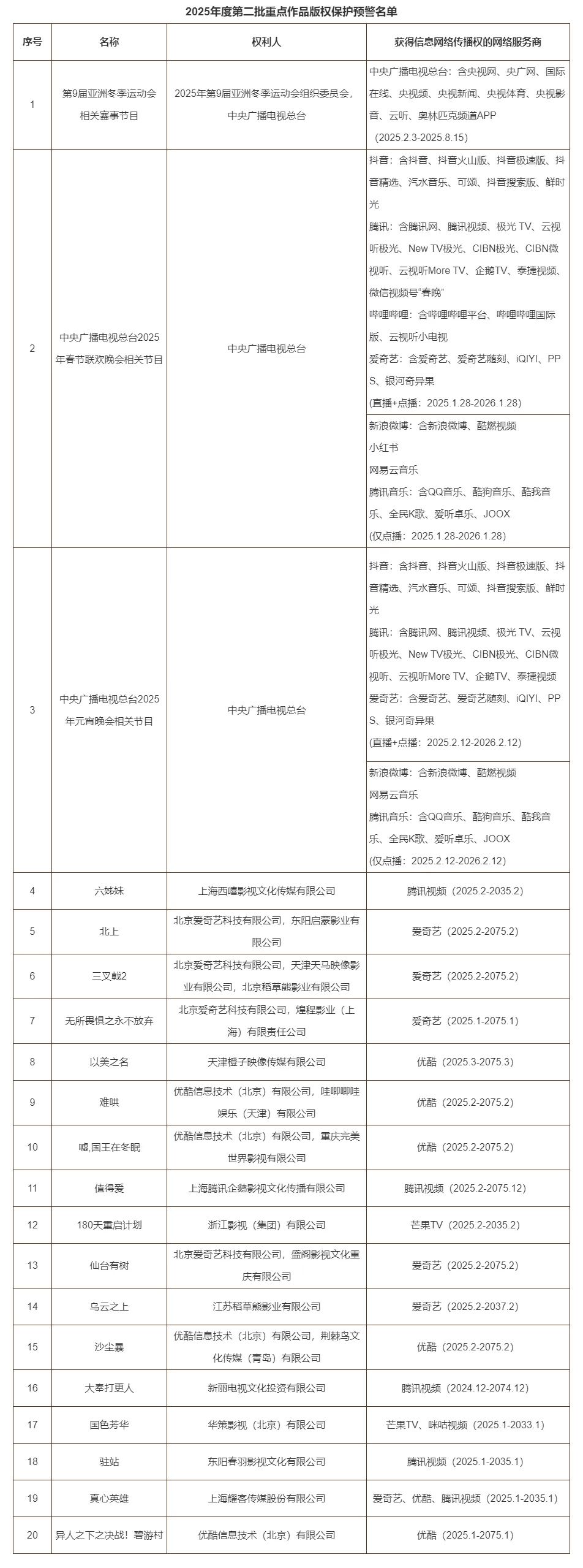 2025年度第二批重点作品版权保护预警名单。(中宣部版权管理局供图)