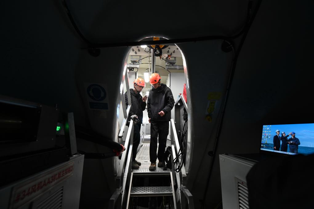郑桂雄(左)和张宗昌在机舱内讨论风机故障处理方法。新华社记者 林善传 摄