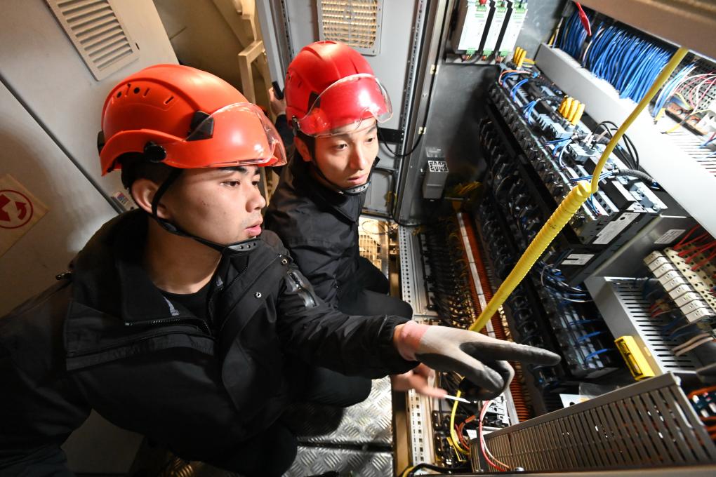 黄志明(右)和郑桂雄在风机机舱内开展故障处理。新华社记者 林善传 摄