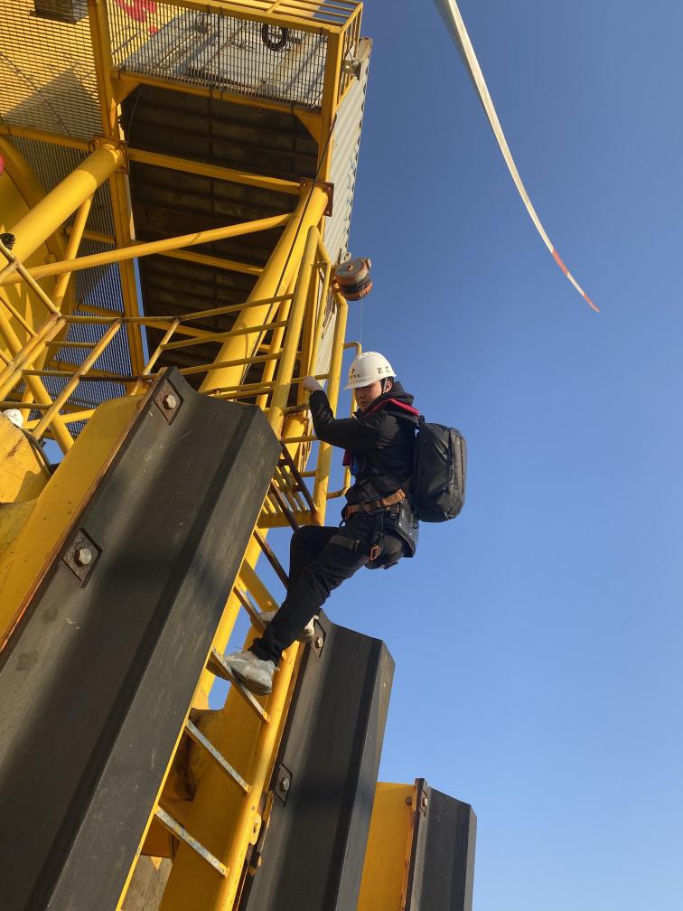 记者爬上海上风电平台基座。新华社记者 林善传 摄