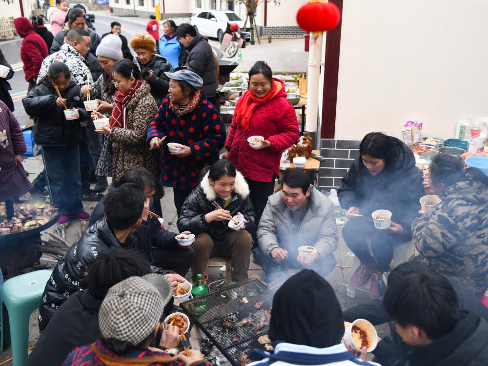 1月25日,新华村的左邻右舍来到杨芬家参加乔迁宴。新华社记者 王曦 摄