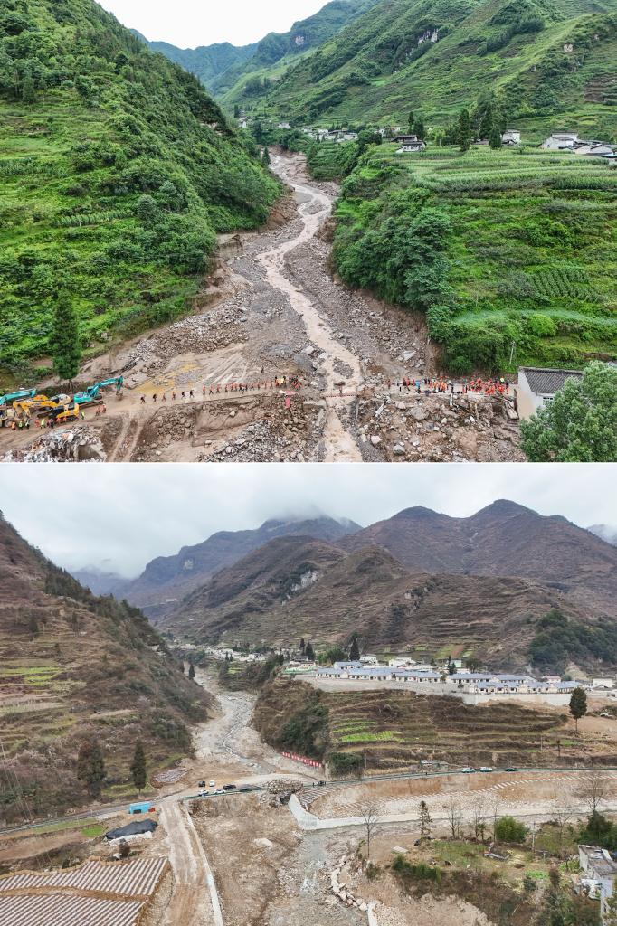 拼版照片:上图是2024年7月21日拍摄的四川省雅安市汉源县马烈乡新华村搜救现场(无人机照片)。新华社记者 王曦 摄;下图是2025年1月25日拍摄的完成灾后重建安置点和耕地恢复的新华村(无人机照片)。新华社记者 王曦 摄