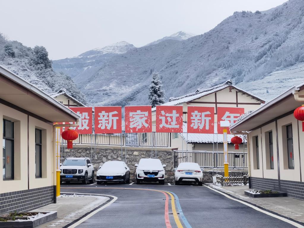 被山洪泥石流冲毁的豆腐石老桥处搭起了钢便桥,过桥后百余米便来到了新华村灾后重建安置点。安置点中,青瓦黄墙的房屋整齐罗列,雪中传来爆竹声声,灾后仅6个月,40户安置户村民陆续搬进宽敞明亮的新居。