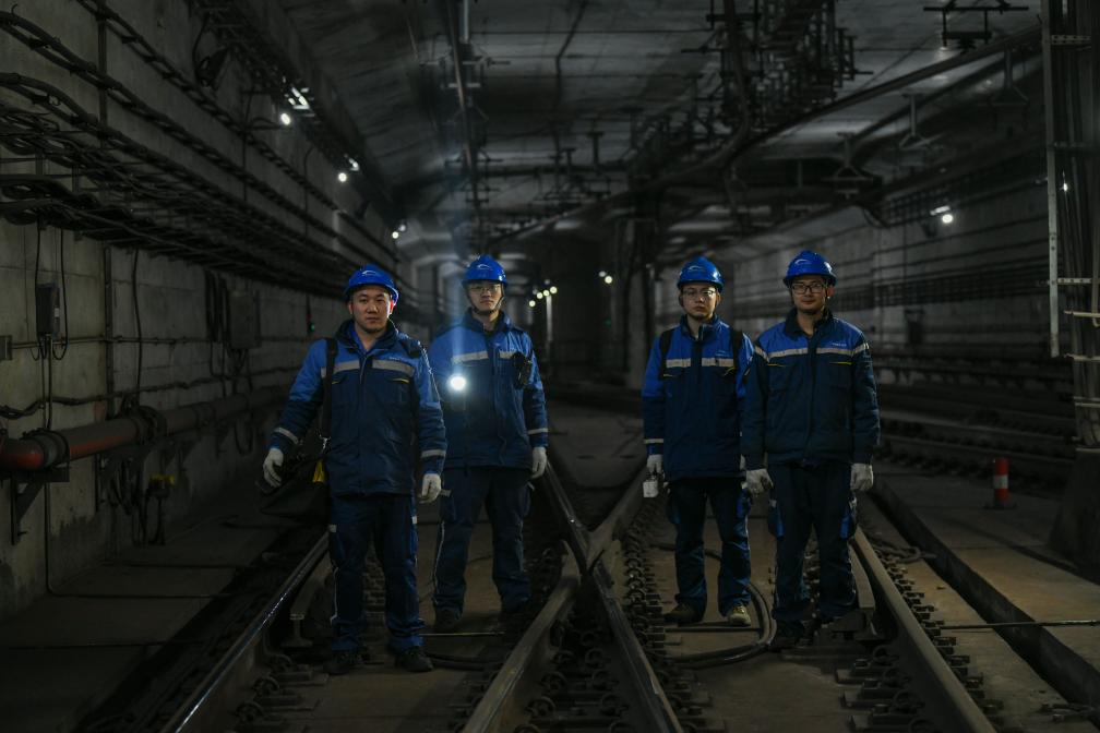 1月26日拍摄的成都地铁北郊接触网二班工作人员曾吕帅、王忠月、蒋俊伟和杨力(从左至右)。新华社记者 胥冰洁 摄
