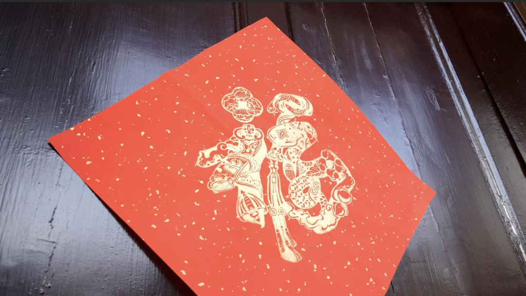 在苏州年画博物馆,苏州市市级非遗代表性项目桃花坞木刻年画代表性传承人创作了蛇年年画《巳时富贵》。红蛇盘绕聚宝盆,周围点缀牡丹、寿桃,寓意生生不息、花开富贵、吉祥如意。