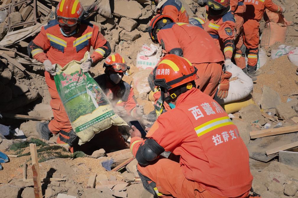 1月11日,救援人员在古荣村搜寻废墟内的物资。新华社记者 洛卓嘉措 摄