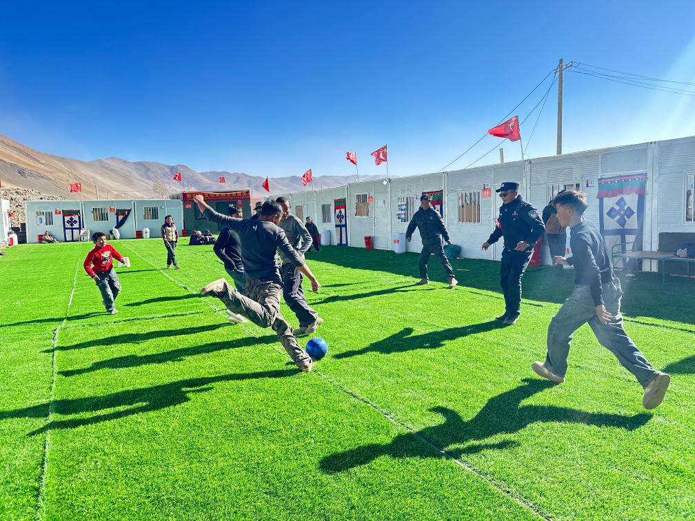 1月28日,古荣村安置点的孩子们正和执勤民警一同踢球。新华社记者 索朗德吉 摄