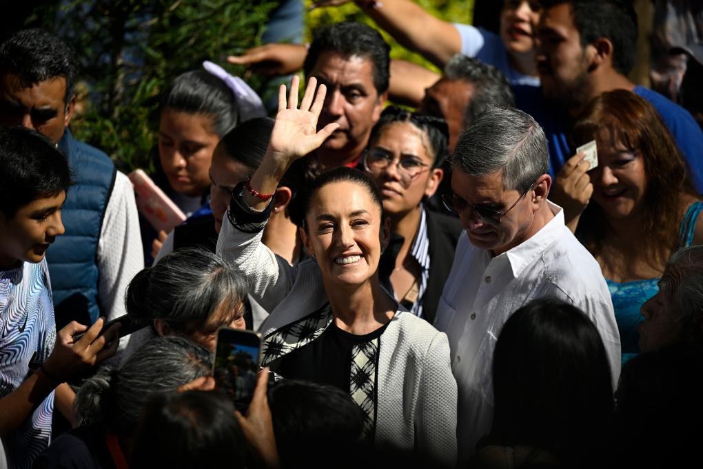 2024年6月2日,在墨西哥首都墨西哥城,墨西哥执政党国家复兴运动党所在竞选联盟总统候选人克劳迪娅·辛鲍姆抵达投票站。