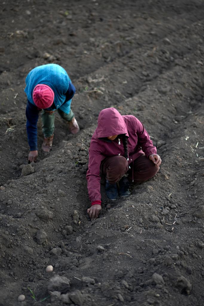 2024年10月10日,农户在秘鲁万卡约市附近的田地中播种马铃薯种薯。