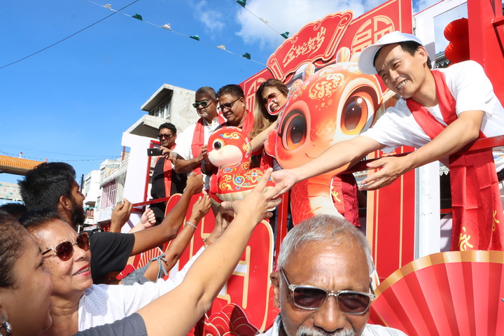 1月25日,在毛里求斯首都路易港,参加2025“欢乐春节”花车巡游活动的花车嘉宾与现场观众进行互动。新华社发(阿利·素拜摄)