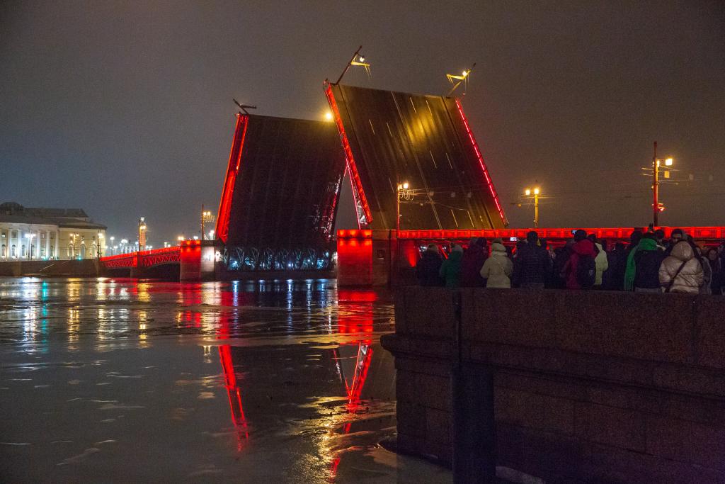 1月29日凌晨,在俄罗斯圣彼得堡,人们在涅瓦河畔观看亮起“中国红”的冬宫桥开桥。新华社发(莫京娜摄)