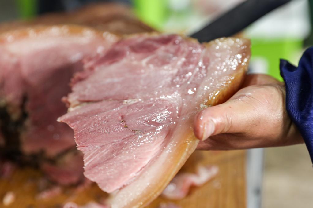 1月23日,在陇西县巩昌镇六一村“镇北腊肉”加工作坊内,陇西腊肉制作技艺省级代表性传承人张营军展示煮熟的腊肉成色。新华社记者 郎兵兵 摄