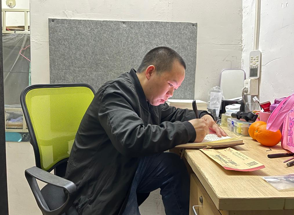 杨秀祥在出租屋内登记助学情况。 新华社记者 骆飞 摄