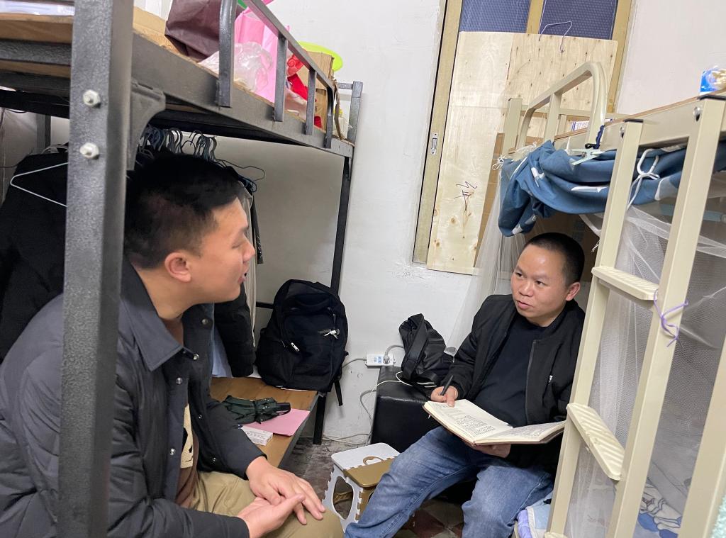 杨秀祥(右)在出租屋内给记者介绍助学情况。新华社发