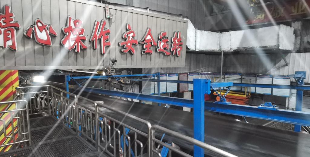 记者随综采三队队长兰荣搭乘一辆无轨胶轮防爆车,驶入副井口。这是一条漫长的下坡隧道。随着车子缓缓行驶,后面的洞口逐渐变小,直到消失。