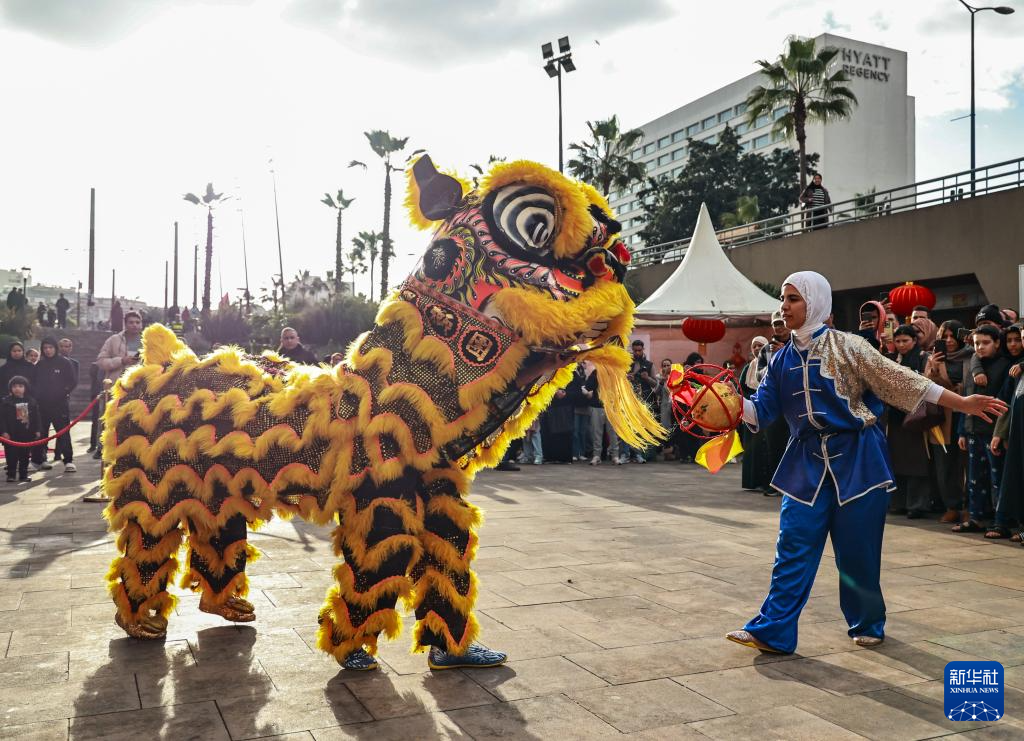 1月17日,在摩洛哥卡萨布兰卡的“中国庙会”活动现场,摩洛哥青年表演舞狮。新华社记者 霍晶 摄