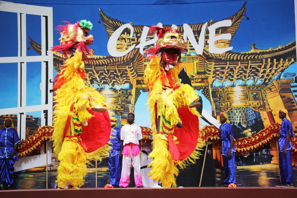 1月25日,在贝宁科托努的贝宁中国文化中心,演员在春节联欢晚会上表演舞狮。新华社发(塞拉芬摄)