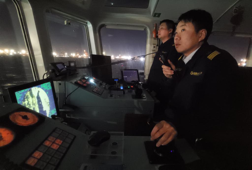 夜间行船,为了尽可能保证视线不被干扰,驾驶室内没有任何灯光,只有雷达、航行系统以及一些按键发出亮光,拖轮前后的灯也都要全部熄灭。视野受限,是夜间工作最大的难题。“你得打起十二分的精神。”冷龙龙说。