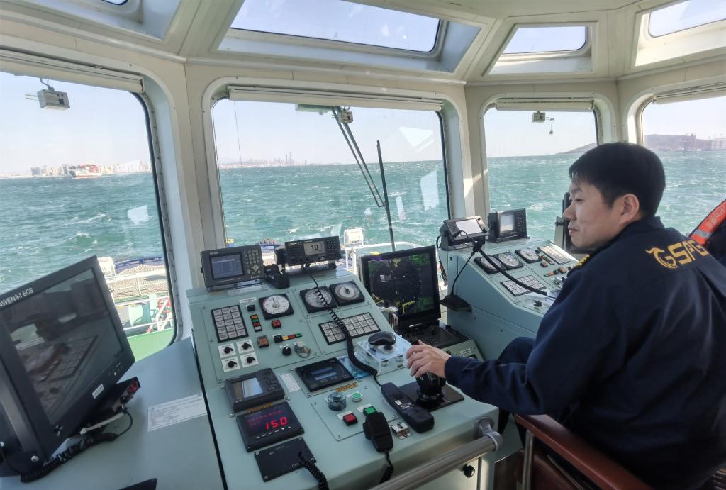 冷龙龙正在驾驶拖轮。新华社记者王凯 摄