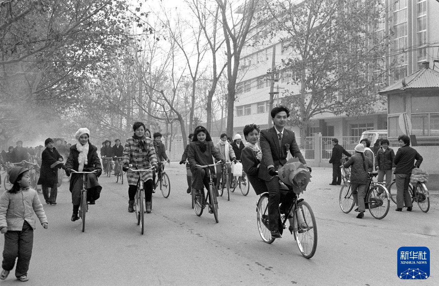 1990年春节期间,在陕西西安,胸挂红花的新郎用自行车驮着新娘经过街头。那个年代,用自行车接新娘曾经一度成为流行的结婚方式。新华社记者 和坪 摄