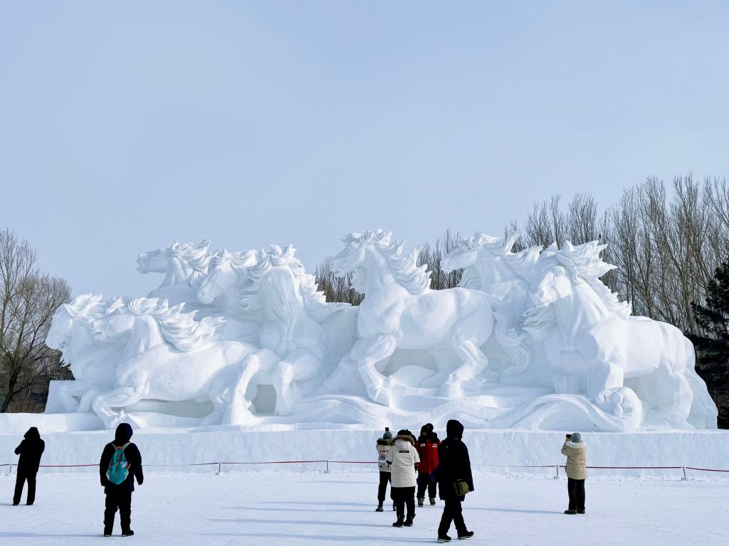 新春佳节,不少游客来到哈尔滨太阳岛雪博会观赏雪雕,在冰天雪地中欢度新年。太阳岛雪博会用新春元素装点园区,年味十足。