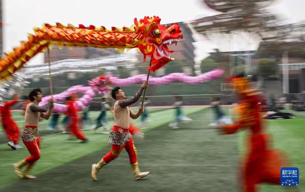 1月2日,铜梁龙舞演员在重庆市铜梁区职业教育中心进行日常训练。
