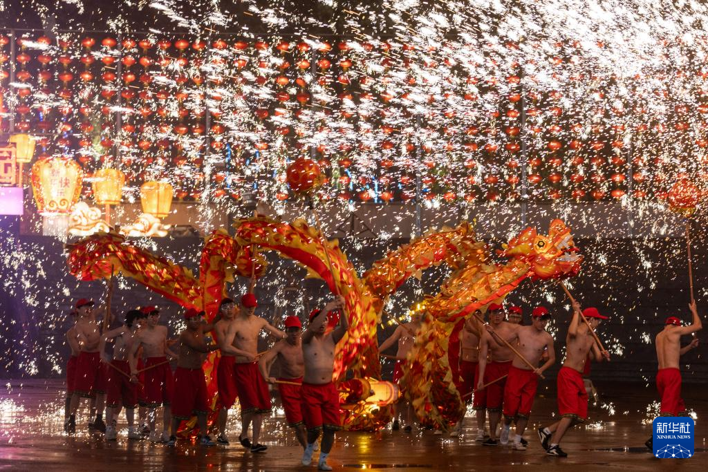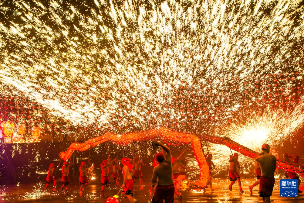 铜梁龙舞火龙表演现场,匠人们以精湛的技艺,将1500摄氏度的铁水抛向空中,再用木板奋力击打,瞬间火花四溅,犹如万点星辰绽放,为观众带来视觉盛宴。