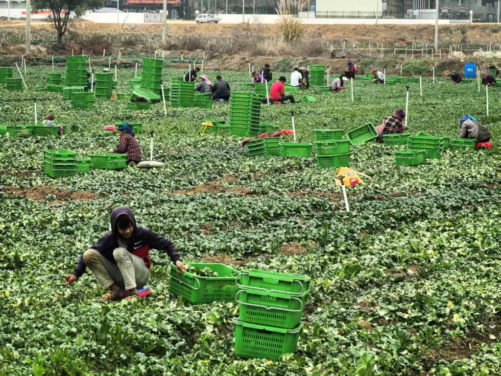 在贺州农投平桂长龙供港蔬菜基地,工人在采摘上海青。新华社记者王楚然 摄