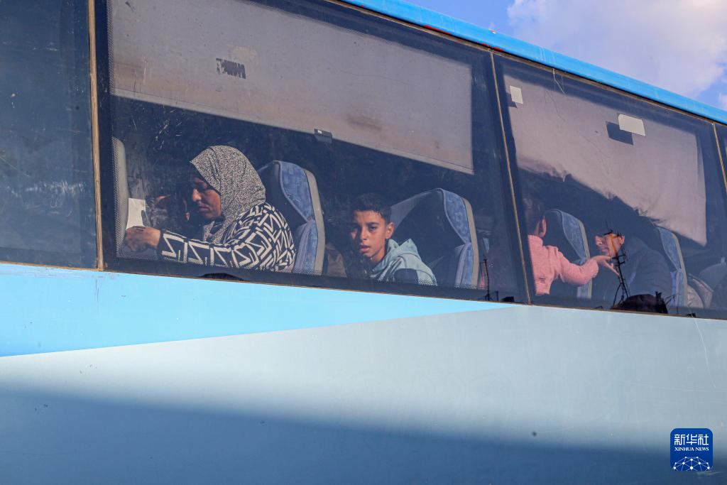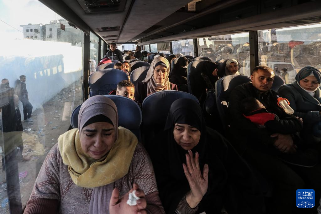 2月1日,在加沙城,伤病员乘车准备前往拉法口岸。新华社发(里泽克·阿卜杜勒贾瓦德摄)