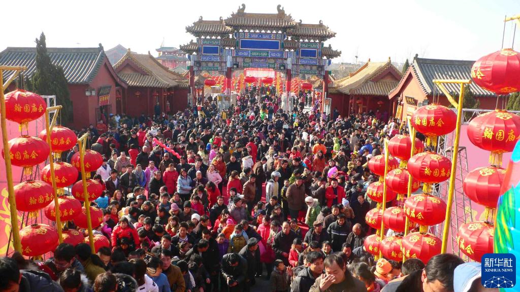 2019年2月16日,游客在河南开封翰园文化庙会上观看舞狮表演。新华社记者 朱祥 摄