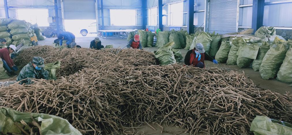 在胡会乡晋西北中药健康产业孵化园五寨县正和堂药材有限公司的仓库,工人挑选黄芪。(受访对象供图)