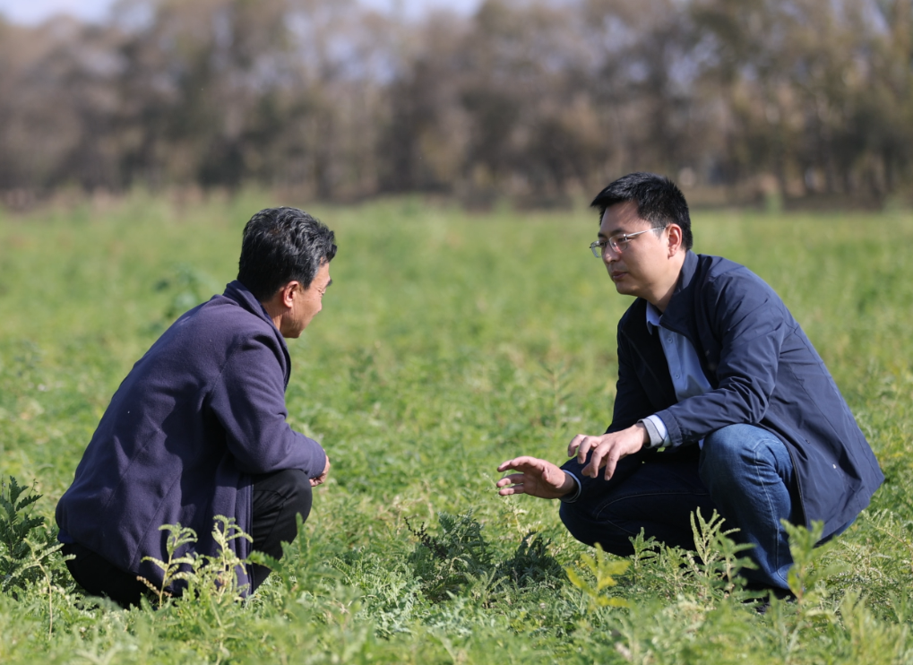 国家中医药管理局挂职干部、五寨县政府党组成员张东亮(右)在当地调研黄芪育苗种植基地药材生长情况。(受访对象供图)