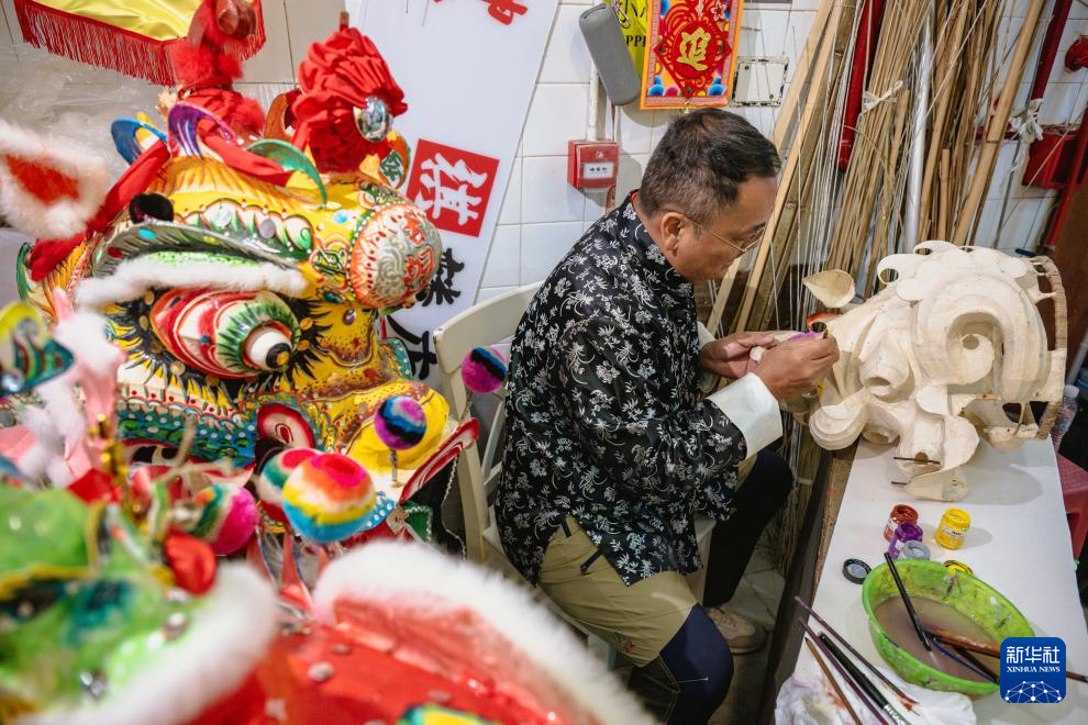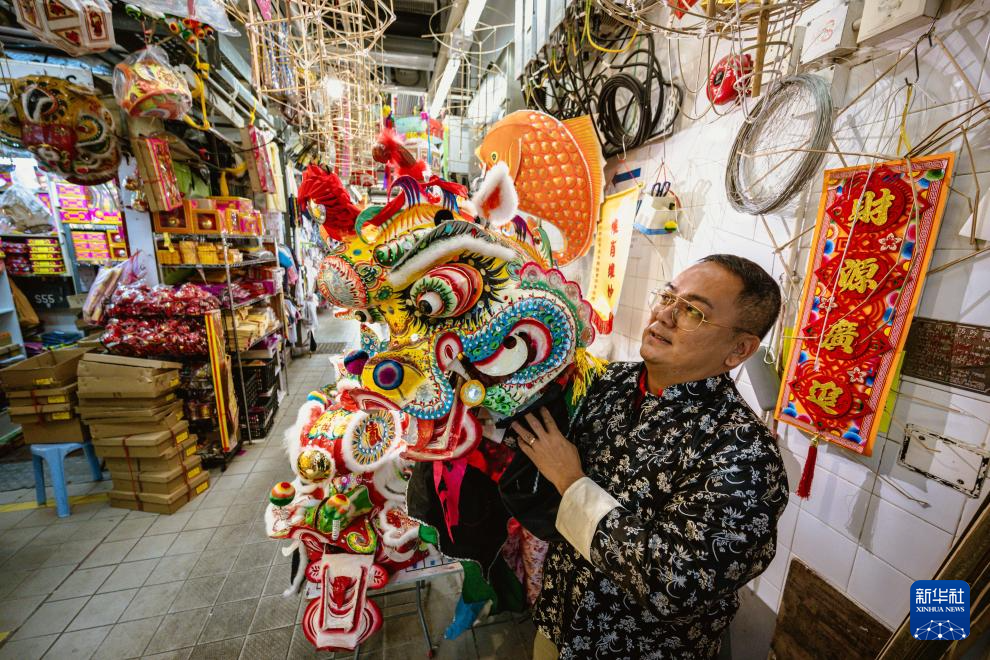 香港麒麟扎作师傅冒卓祺在元朗大桥街市展示其制作的麒麟头(2024年12月24日摄)。新华社记者 朱炜 摄