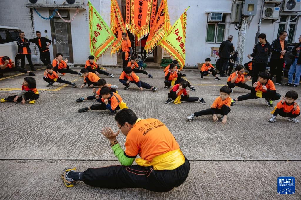 香港西贡坑口区儿童在沙田曾大屋前学习舞麒麟(2025年1月4日摄)。新华社记者 朱炜 摄