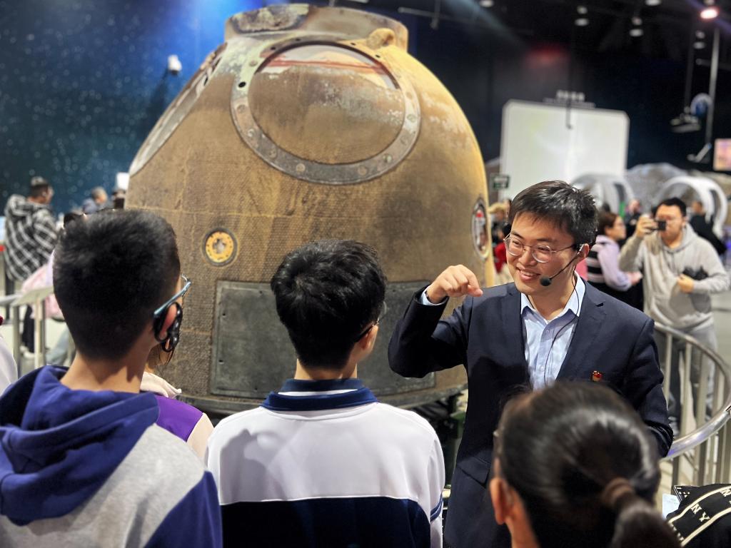 1月31日下午,科技辅导员黄践为参加探馆活动的中学生讲解“神舟一号”返回舱实物。新华社记者温竞华 摄