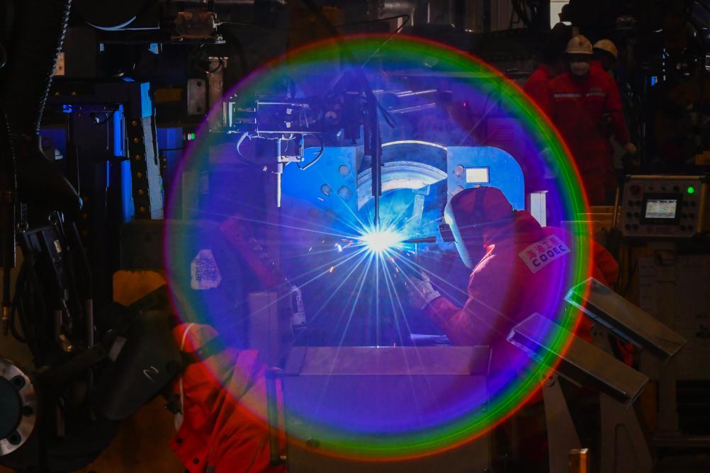1月28日,工人在海油工程天津智能化制造基地工艺管线预制车间内操作设备。新华社发(杜鹏辉摄)