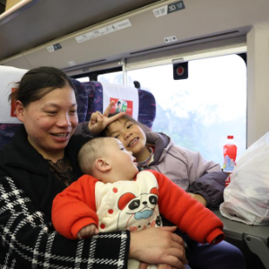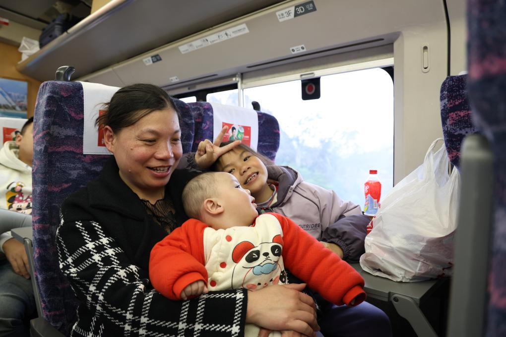 2月3日,廖秋艳与孩子在返岗专列上。新华社记者 钟焯 摄