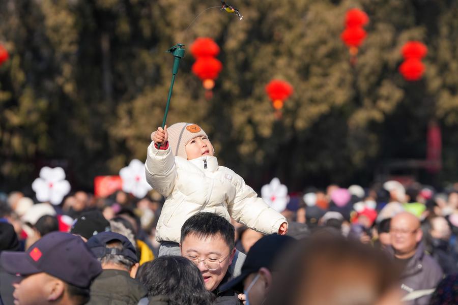 1月29日,在地坛庙会上,一名小朋友坐在家长的肩膀上玩耍。新华社记者 鞠焕宗 摄