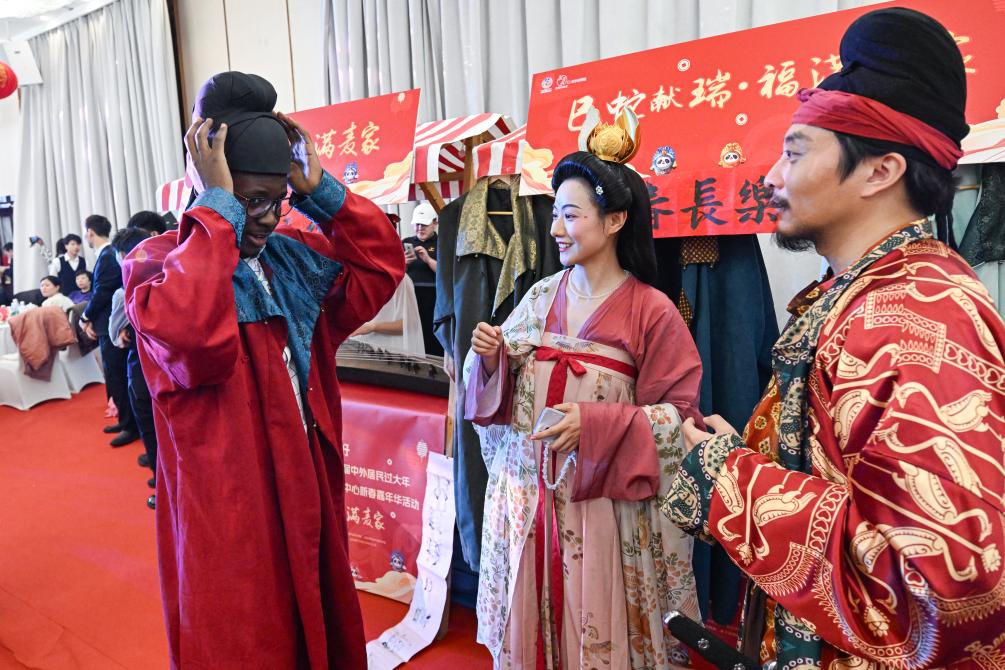 在北京市朝阳区麦子店街道和中国国际青年交流中心共同主办的新春嘉年华活动上,一名外国友人(左)体验中国传统服饰。新华社记者 陈钟昊 摄