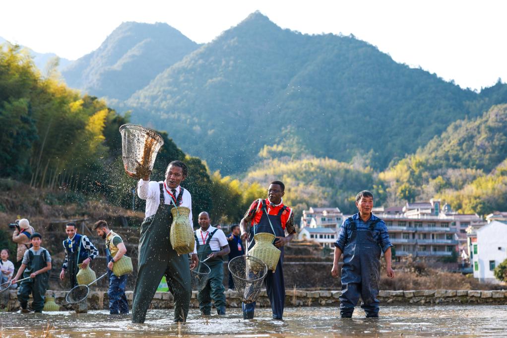 在浙江省丽水市青田县方山乡举行的2025浙江侨乡中国年活动上,外国友人在稻田内体验捕捞田鱼。新华社记者 江汉 摄