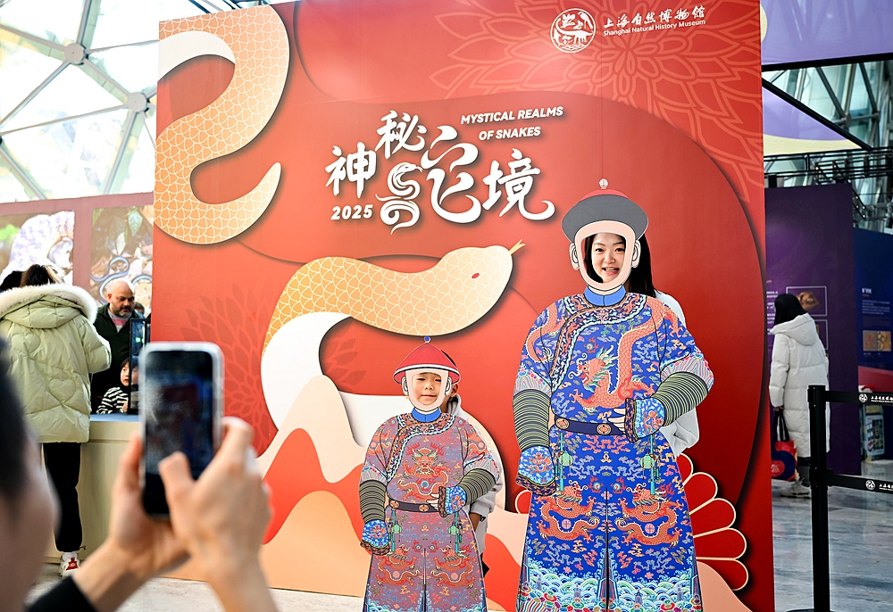 观众在上海自然博物馆蛇年生肖特展外的活动展板前打卡拍照。新华社发(陈浩明摄)