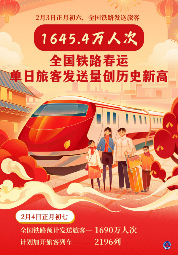 新华社北京2月4日电(记者樊曦、王优玲)记者从中国国家铁路集团有限公司获悉,2月3日正月初六,全国铁路发送旅客1645.4万人次,创春运单日旅客发送量历史新高,运输安全平稳有序。2月4日正月初七,全国铁路预计发送旅客1690万人次,计划加开旅客列车2196列。