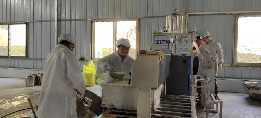 2月3日一早,经过短暂放假后,王兴龙的捧乍臭豆腐加工厂恢复了往日的繁忙。磨浆、煮浆、滤渣、点兑、压榨,工人们分工有序。