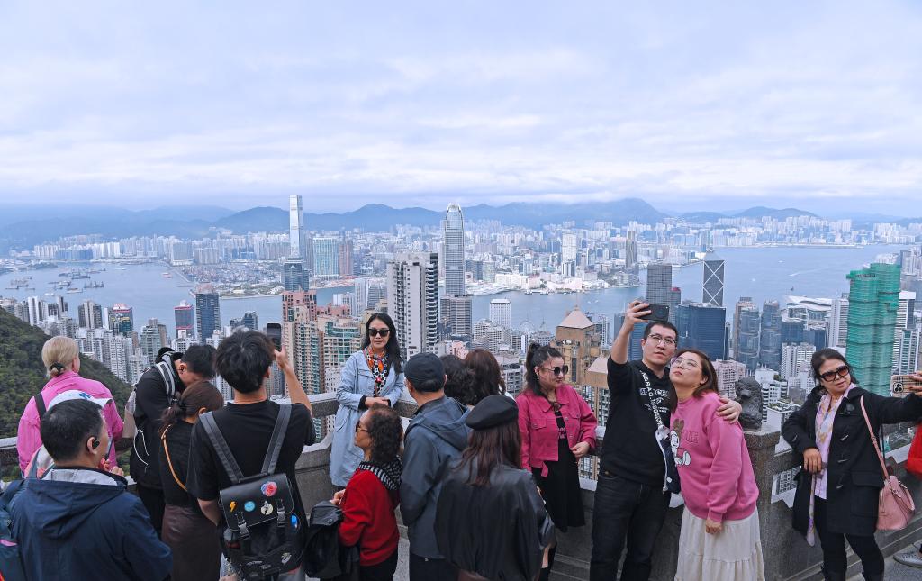2月1日,游客在香港太平山顶游览。新华社记者 陈铎 摄