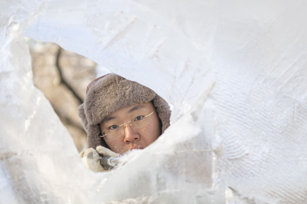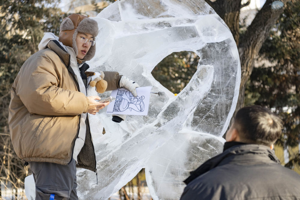 2025年1月3日,刘芮麟在雕刻亚冬会主题冰雕作品部件。