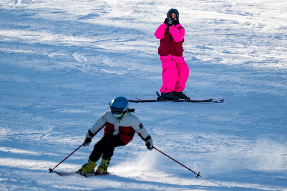 2025年1月14日,单宝源(右)在游客滑雪时跟拍。