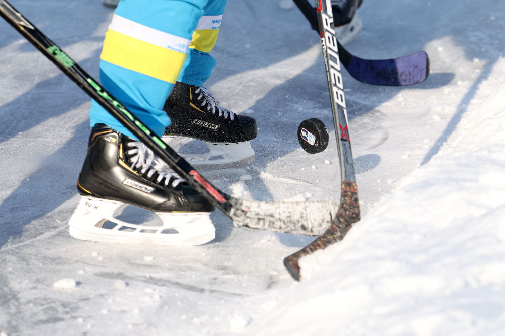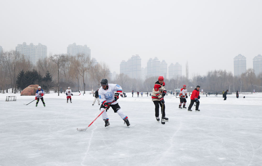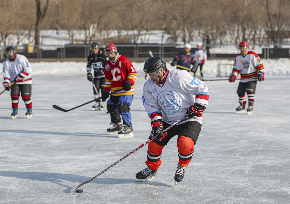 2025年1月11日,孙作新在丁香公园内和队友打冰球。
