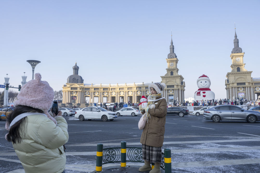 2025年1月13日,在哈尔滨建筑艺术广场,游客在雪中拍摄照片。