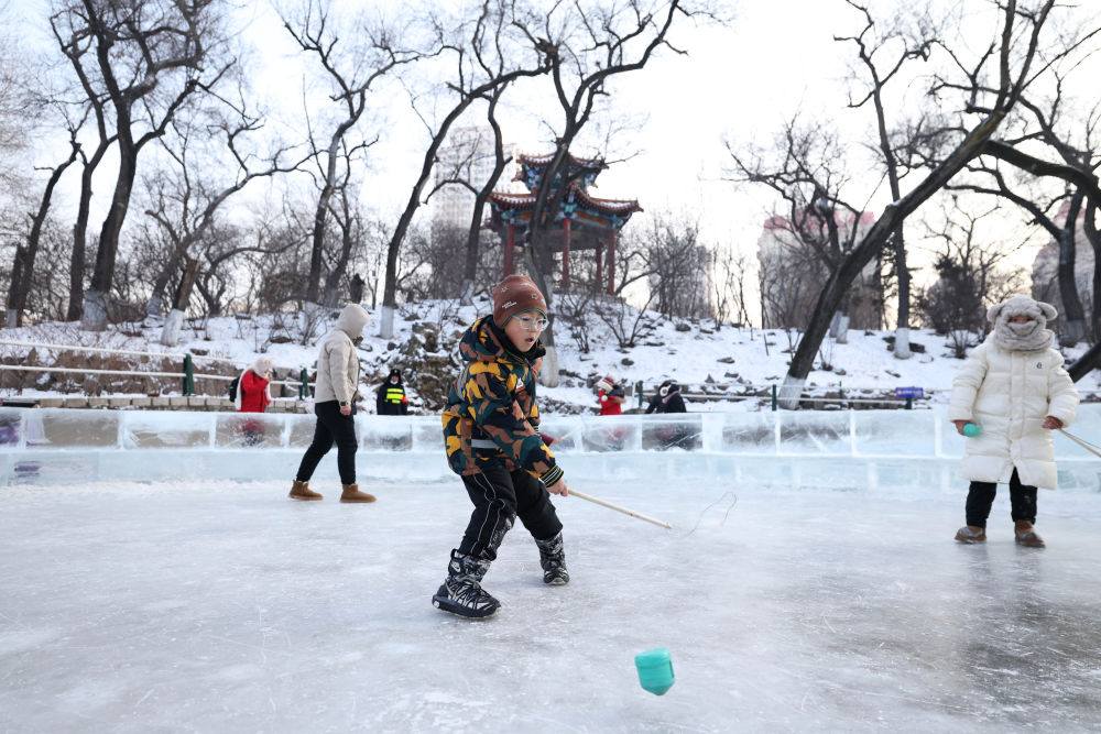 2025年1月11日,孙作新在哈尔滨丁香公园内打冰球。